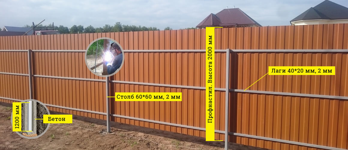 Столбы: 40х40х3000 мм. Толщина металла 2 мм. Шаг стоек 3 м.